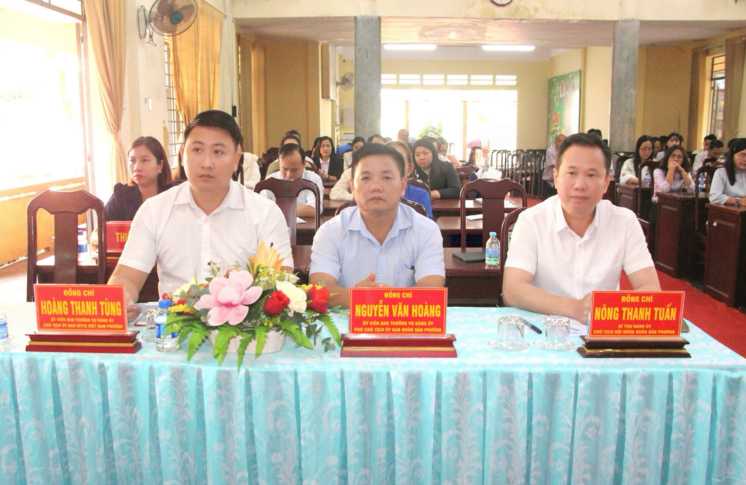 Chủ trì Hội nghị có đồng chí Nông Thanh Tuấn- Bí thư Đảng ủy, Chủ tịch HĐND phường. Tham dự có đồng chí Đỗ Chánh Quang- Phó Bí thư Thường trực Đảng ủy phường; đồng chí Hoàng Trọng Phương- Phó Bí thư Đảng ủy, Chủ tịch UBND phường; đồng chí Hoàng Thanh Tùng- UVTV, Chủ tịch UBMTTQ Việt Nam phường; các đồng chí Thường trực HĐND, UBND, UBMTTQ Việt Nam phường; lãnh đạo các phòng, ban; cán bộ, công chức, người lao động (cử tri) các cơ quan, đơn vị cùng dự.